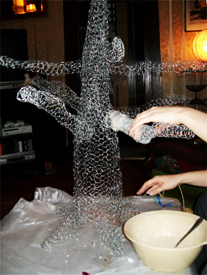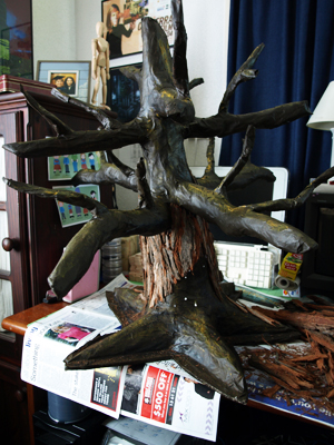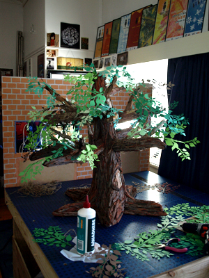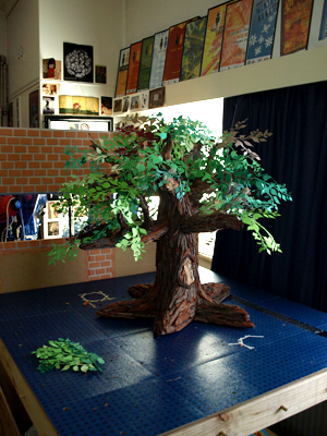 Above is how the miniature set looks in the film. It was built at 1:25 scale and used boxes, cardboard, balsa wood, fake grass and aquarium trees and plants. The base of the buildings were built from cardboard boxes covered with tiny balsa-wood 'bricks' which were then painted with textured paint to look like actual bricks.